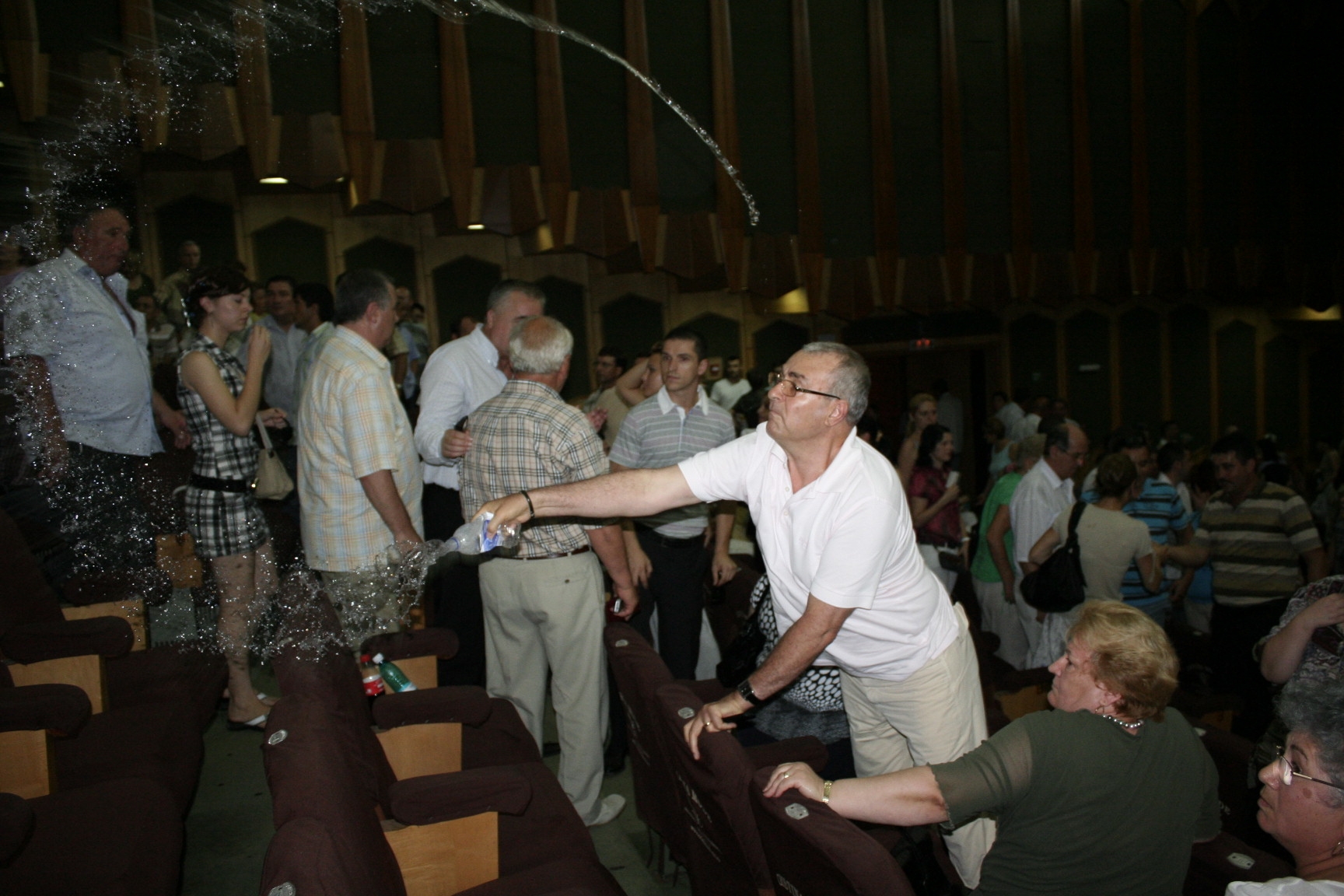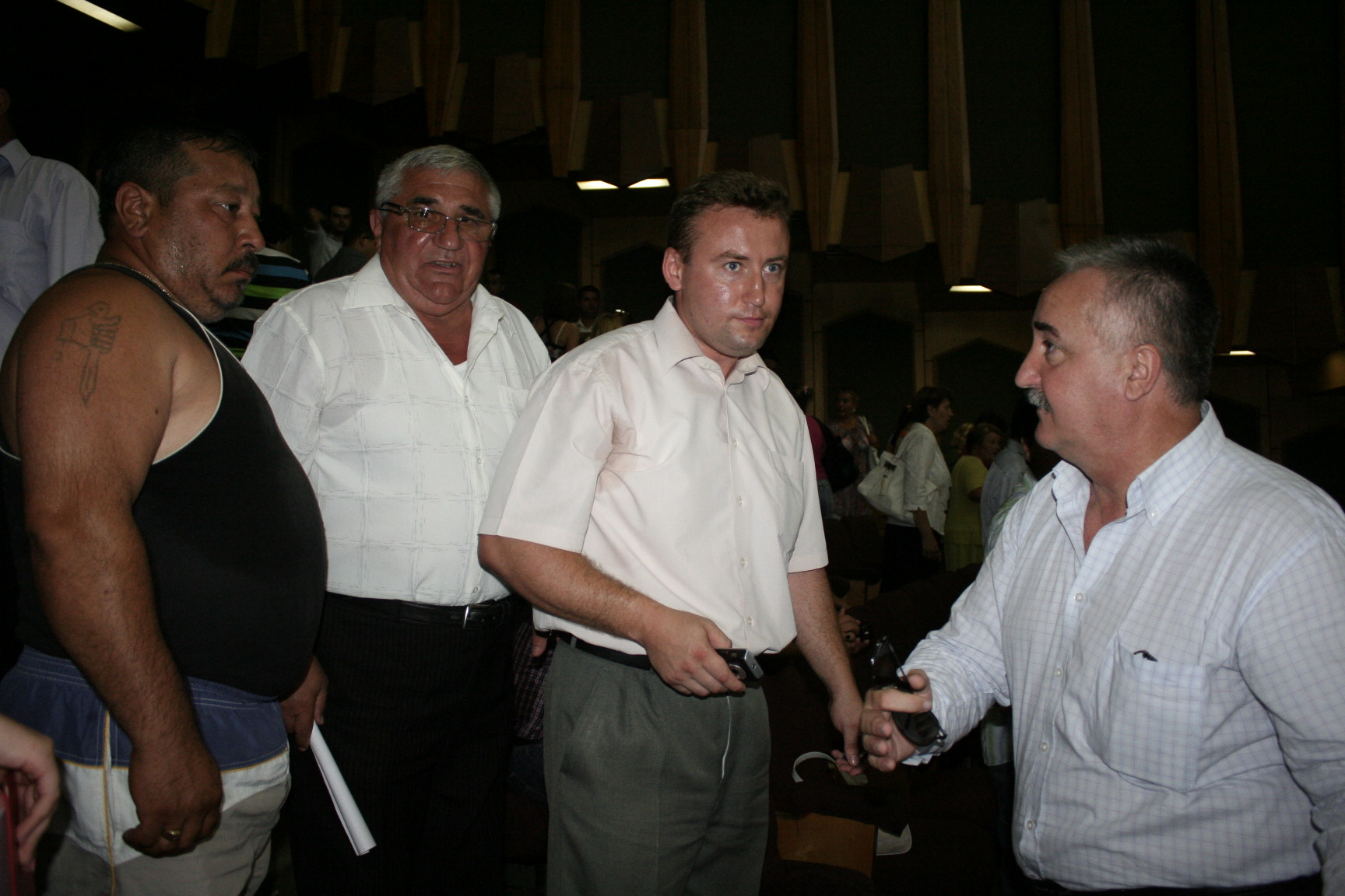 Nu vreau să vă reţin cu prea multe detalii. E vorba de o şedinţă a organizaţiei de partid din care provine Traian Băsescu, o şedinţă în care deputatul Maria Stavrositu, prietena Elenei Udrea (o vedeţi la microfon în fotografia 3) a încercat să preia şefia filialei municipale, iar colegul ei, senatorul Mircea Banias, s-a opus. A ieşit cu scandal, după cum vedeţi în imagini. A, şi încă ceva. Vă rog să-l remarcaţi pe delegatul PDL din stînga fotografiei cu nr. 2. Mie-mi pare un tip convingător, de viitor şi cred că vom mai auzi despre el.