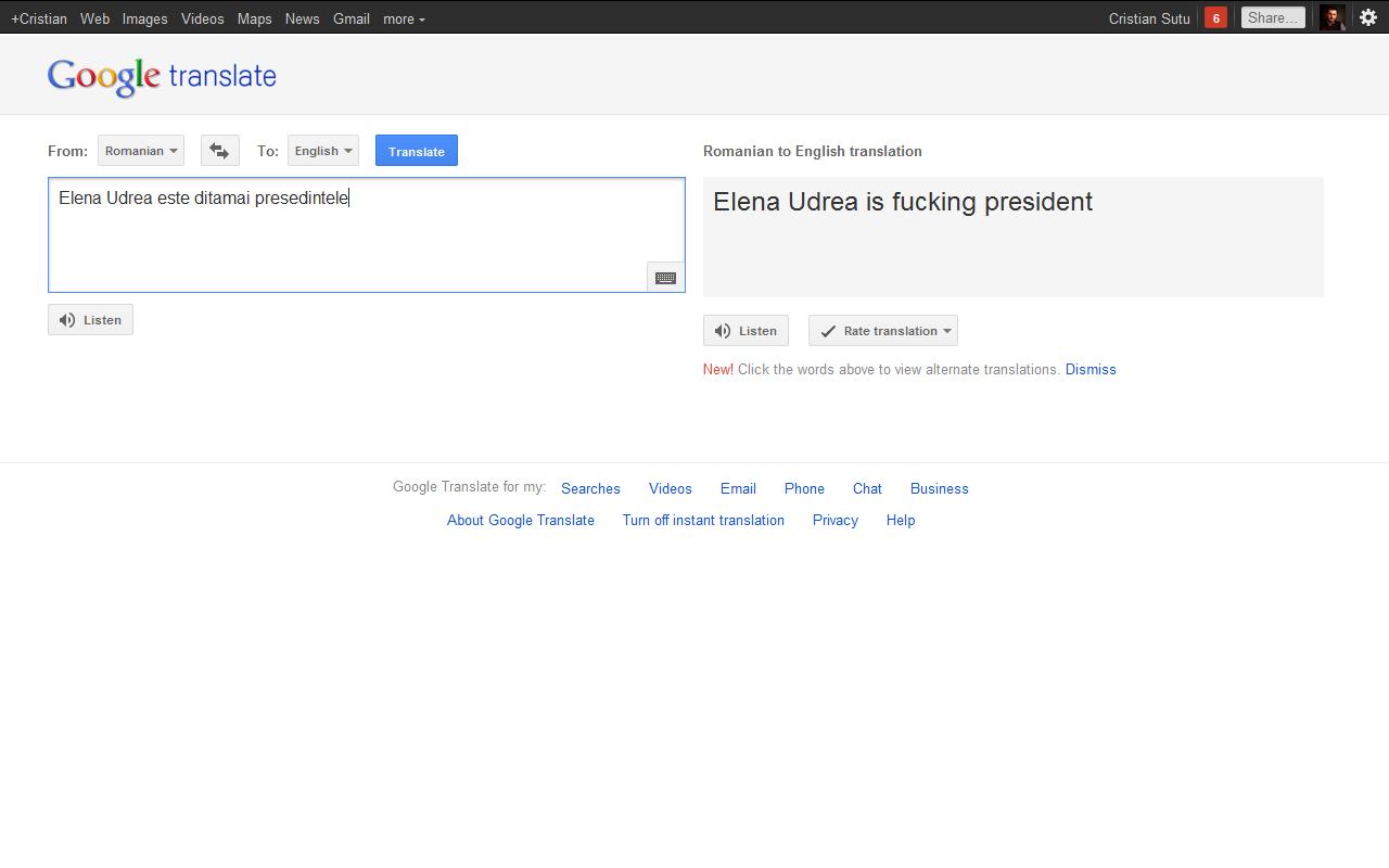 Pentru diversificare, încearcă să traduci în engleză cu Google Translate “Traian Basescu este ditamai presedintele”. Iar în Microsoft Translator,vezi cum sună în engleză “Romania este tara mea de origine”.