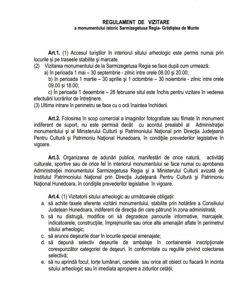 - Potrivit unei hotărîri a Consiliului Județean Hunedoara, care a aprobat în luna iunie un Regulament de vizitare a Cetății Sarmizegetusa, accesul în zonă este interzis în perioada 1 decembrie 2013 – 28 februarie 2014. Vladimir Brilinsky, administratorul parcului arheologic Sarmizegtusa Regia, a declarat recent, citat de Hotnews, că în zona cetății se efectuează lucrări de întreținere, între care și îndepărtarea unor copaci bătrîni prăbușiți la pămînt. (În paranteză fie spus, astă-vară, cînd am fost eu la Sarmizegetusa, același Vladimir Brilinsky îmi povestea că găsise foarte recent, sub un copac prăbușit de la furtună, un obiect arheologic de o valoare inestimabilă. Am scris despre asta aici).